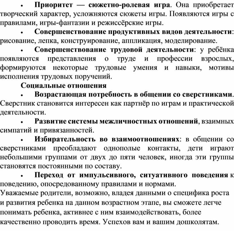 · Приоритет — сюжетно-ролевая игра. Она приобретает творческий характер, усложняются сюжеты игры. Появляются игры с правилами, игры-фантазии и режиссёрские игры.