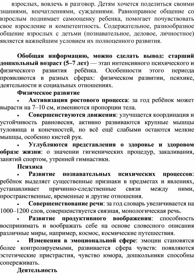Обобщая информацию, можно сделать вывод: старший дошкольный возраст (5–7 лет) — этап интенсивного психического и физического развития ребёнка. Особенности этого периода проявляются в разных сферах: физическом развитии, психике, деятельности и социальных отношениях.