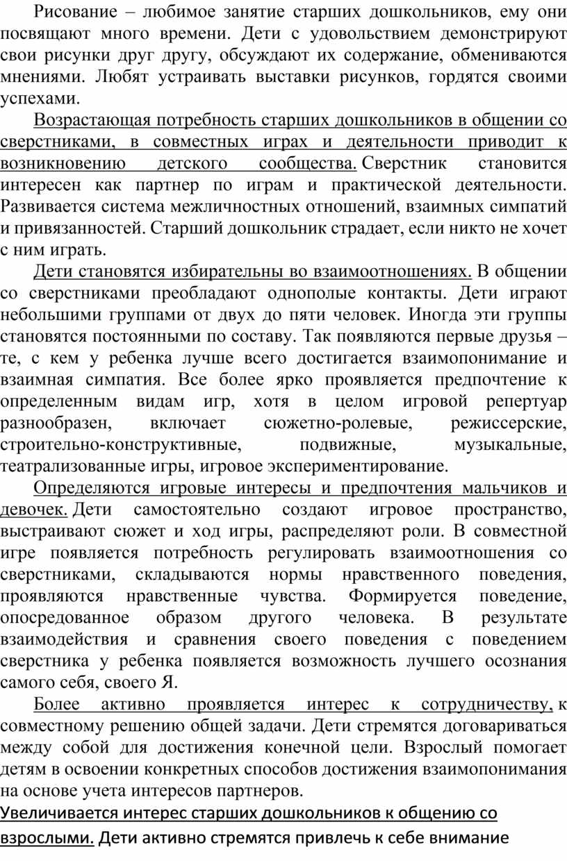 Возрастающая потребность старших дошкольников в общении со сверстниками, в совместных играх и деятельности приводит к возникновению детского сообщества. Сверстник становится интересен как партнер по играм и практической деятельности. Развивается система межличностных отношений, взаимных симпатий и привязанностей. Старший дошкольник страдает, если никто не хочет с ним играть.