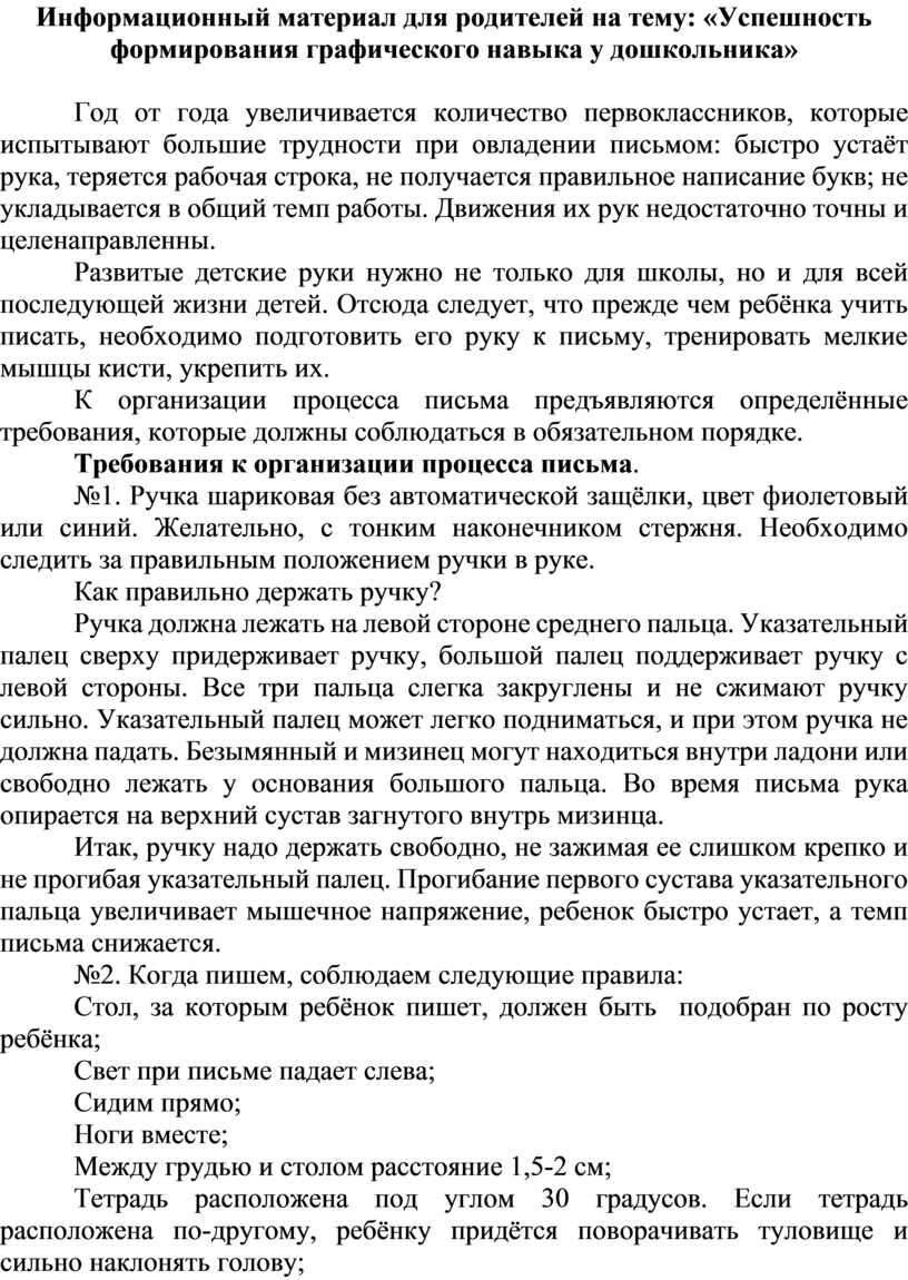 Информационный материал для родителей на тему: «Успешность формирования графического навыка у дошкольника»