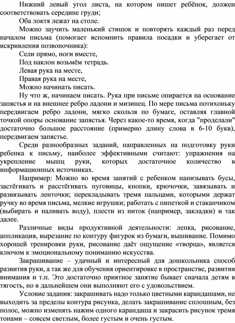 Вот минимум рекомендаций, придерживаясь которых, начиная со среднего дошкольного возраста, вы успешно подготовите руку ребенка к письму, а самого ребенка к усидчивости, концентрации.