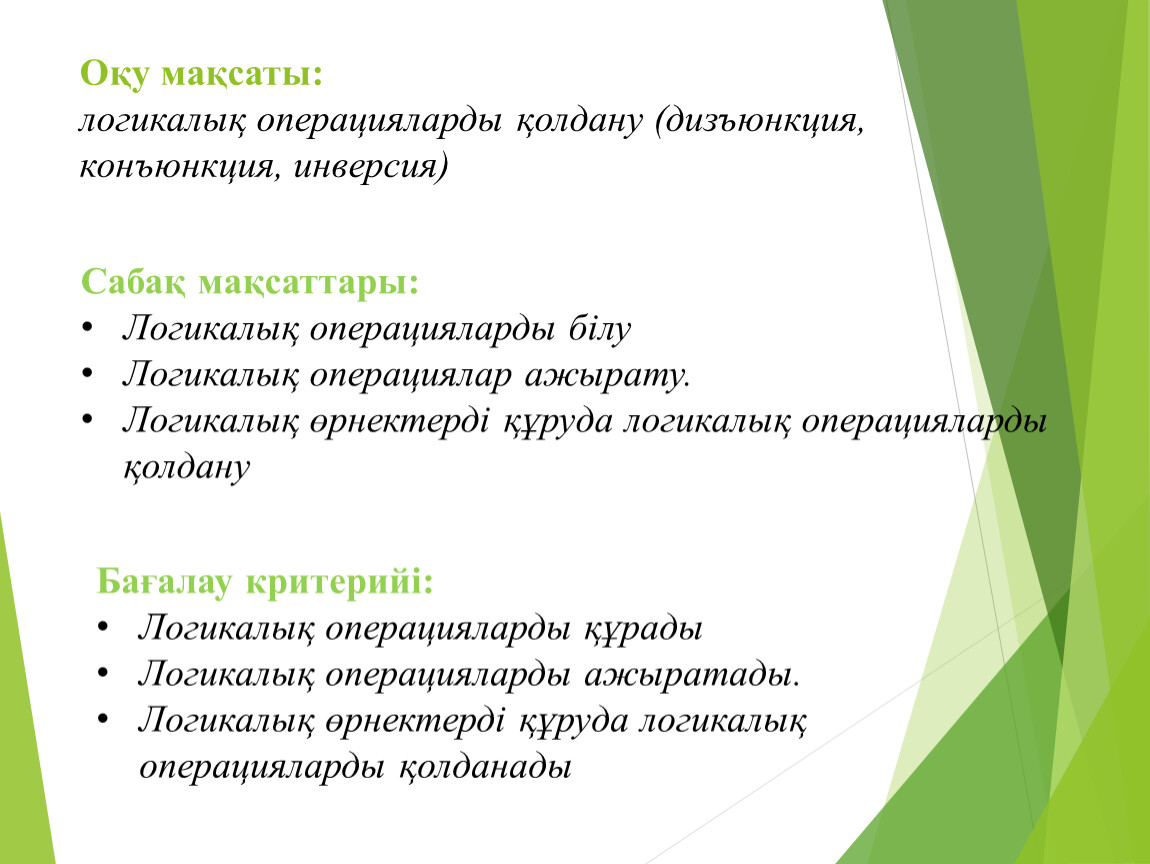 Оқу мақсаты: логикалық операцияларды қолдану (дизъюнкция, конъюнкция, инверсия)