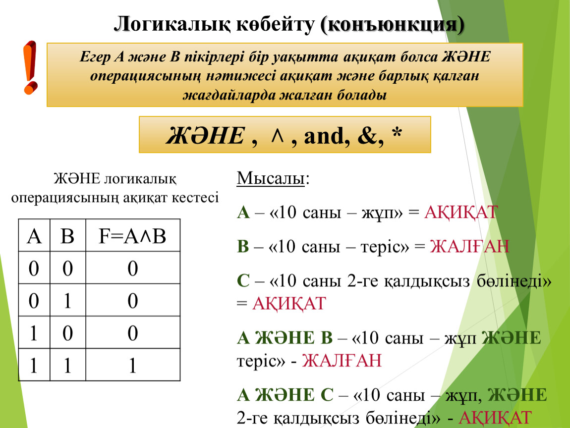 Егер A және B пікірлері бір уақытта ақиқат болса ЖӘНЕ операциясының нәтижесі ақиқат және барлық қалған жағдайларда жалған болады