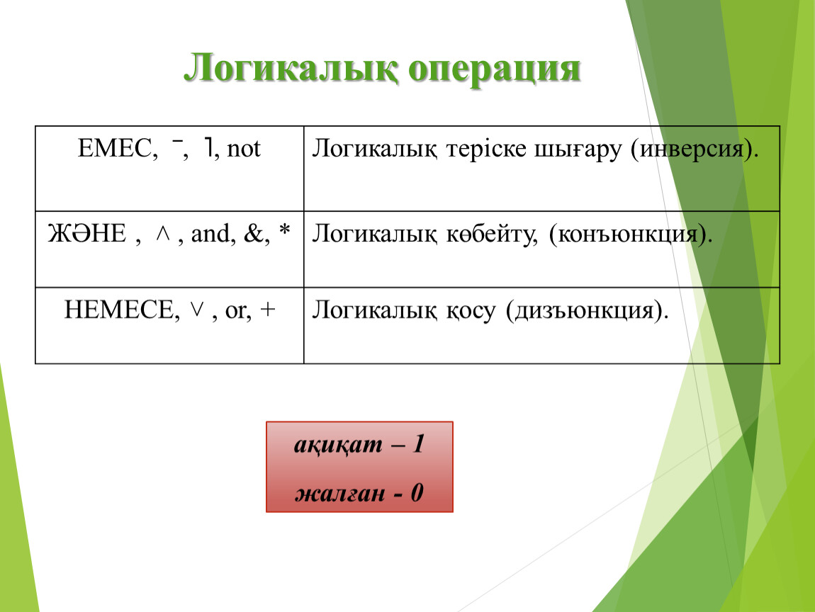НЕМЕСЕ, ˅ , or, + | Логикалық қосу (дизъюнкция). |