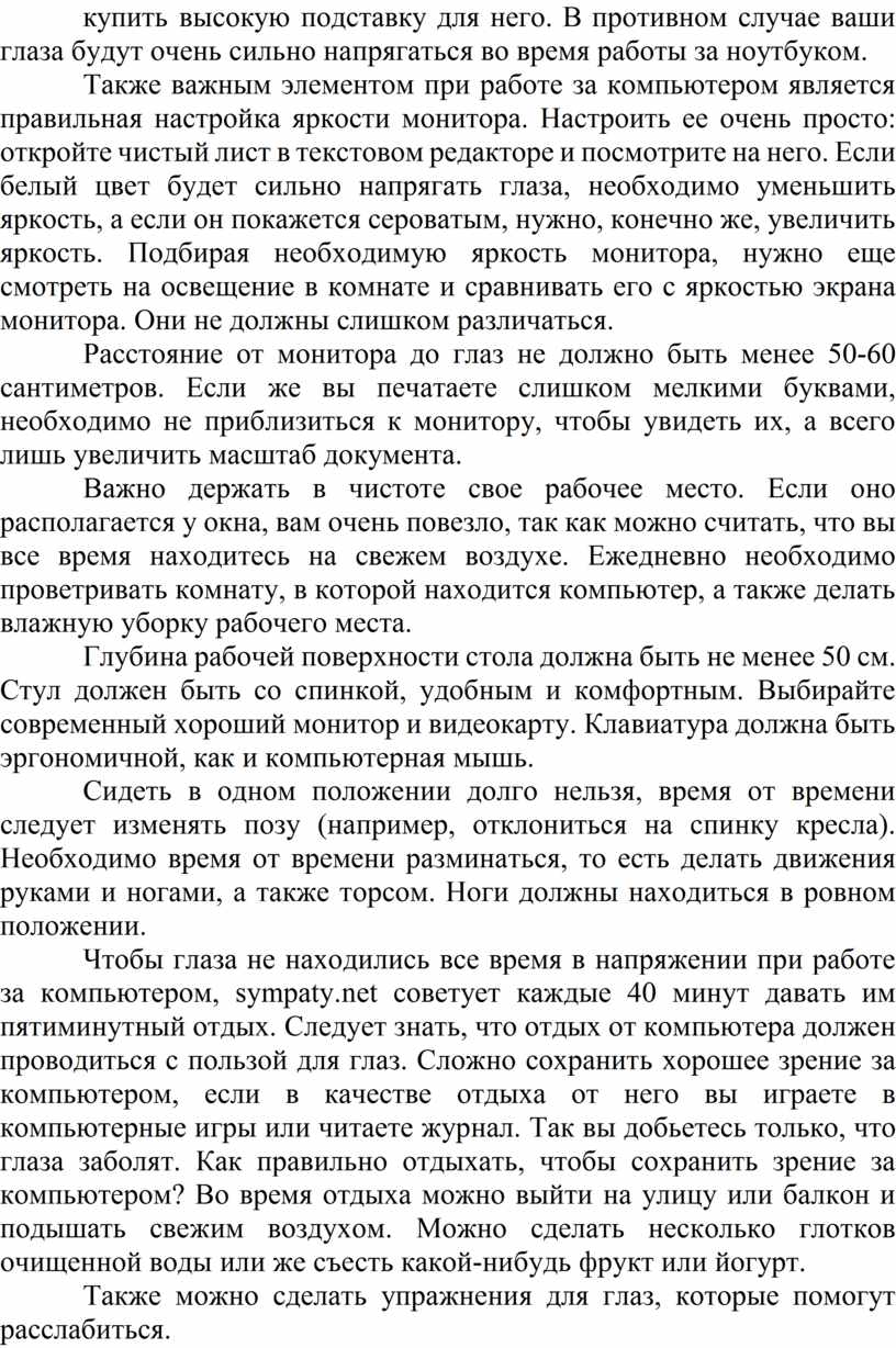 Расстояние от монитора до глаз не должно быть менее 50-60 сантиметров. Если же вы печатаете слишком мелкими буквами, необходимо не приблизиться к монитору, чтобы увидеть их, а всего лишь увеличить масштаб документа.