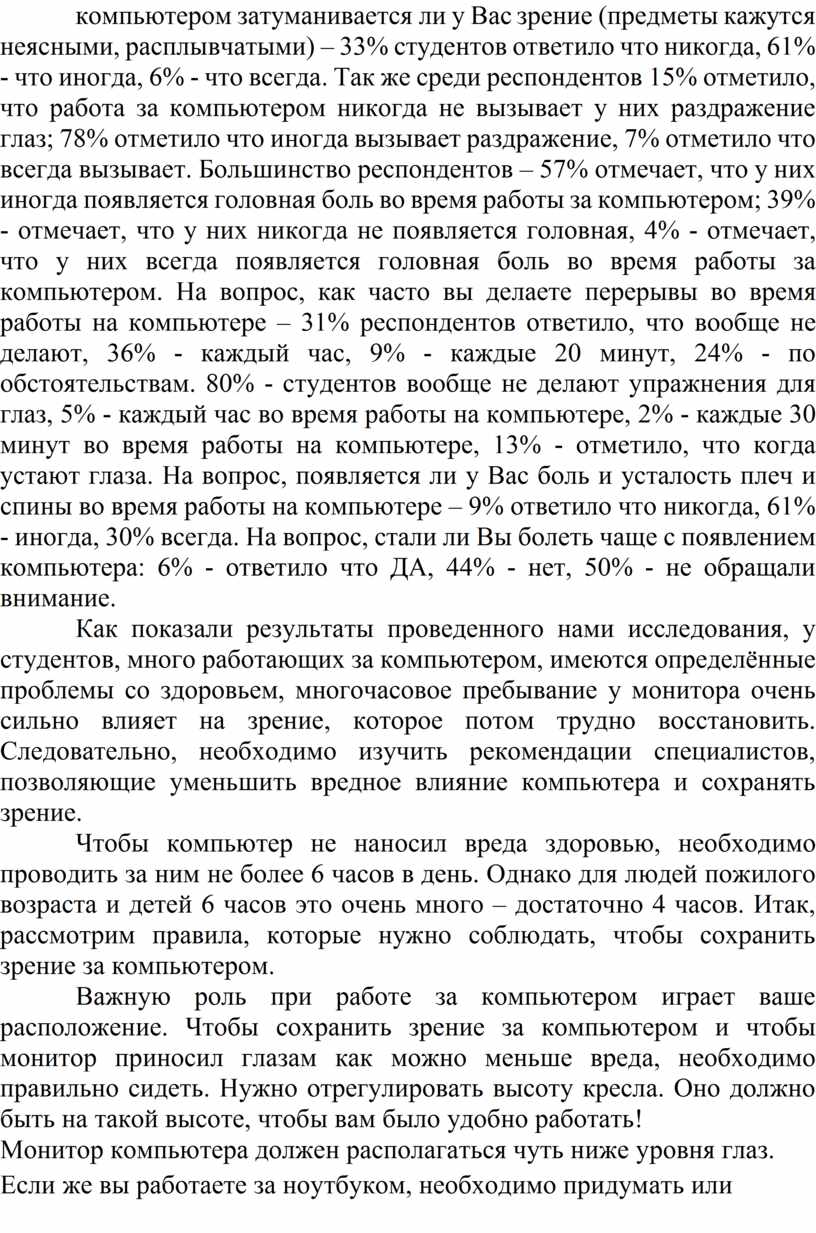 Как показали результаты проведенного нами исследования, у студентов, много работающих за компьютером, имеются определённые проблемы со здоровьем, многочасовое пребывание у монитора очень сильно влияет на зрение, которое потом трудно восстановить. Следовательно, необходимо изучить рекомендации специалистов, позволяющие уменьшить вредное влияние компьютера и сохранять зрение.