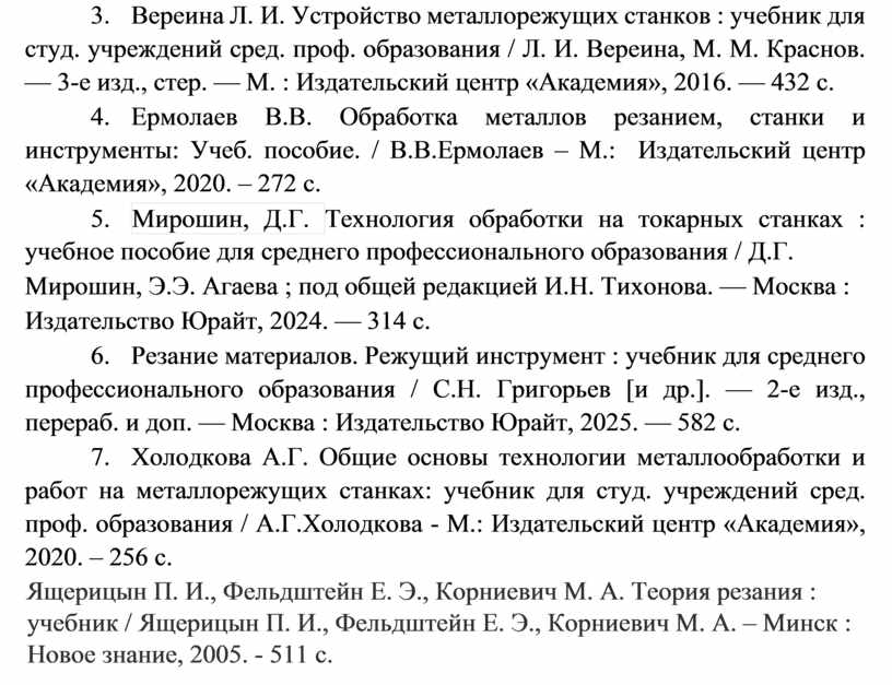 4. Вереина Л. И. Справочник станочника учеб. пособие для образовательных учреждений, реализующих программы нач. проф. образования / Л. И. Вереина, М. М. Краснов. — Москва : Академия, 2006. — 256 с.