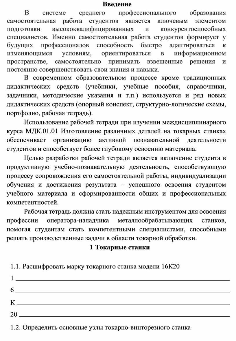 Использование рабочей тетради при изучении междисциплинарного курса МДК.01.01 Изготовление различных деталей на токарных станках обеспечивает организацию активной познавательной деятельности студентов и способствует более глубокому освоению материала.