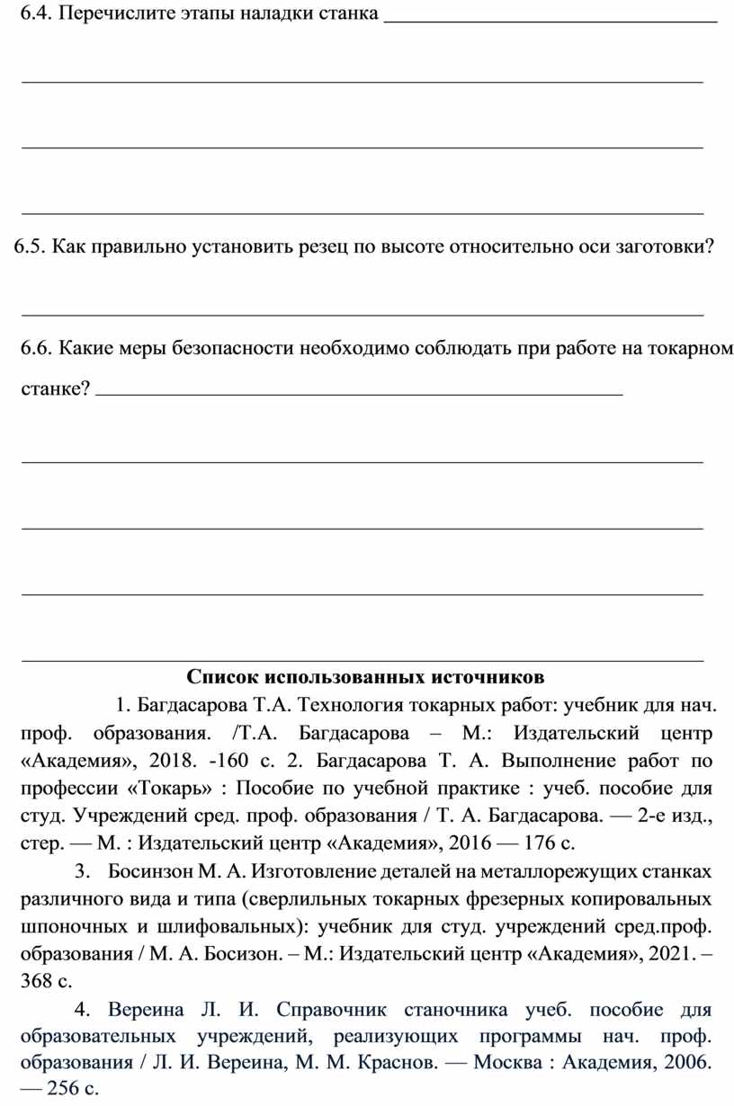 проф. образования. /Т.А. Багдасарова – М.: Издательский центр «Академия», 2018. -160 с. 2. Багдасарова Т. А. Выполнение работ по профессии «Токарь» : Пособие по учебной практике : учеб. пособие для студ. Учреждений сред. проф. образования / Т. А. Багдасарова. — 2-е изд., стер. — М. : Издательский центр «Академия», 2016 — 176 с.