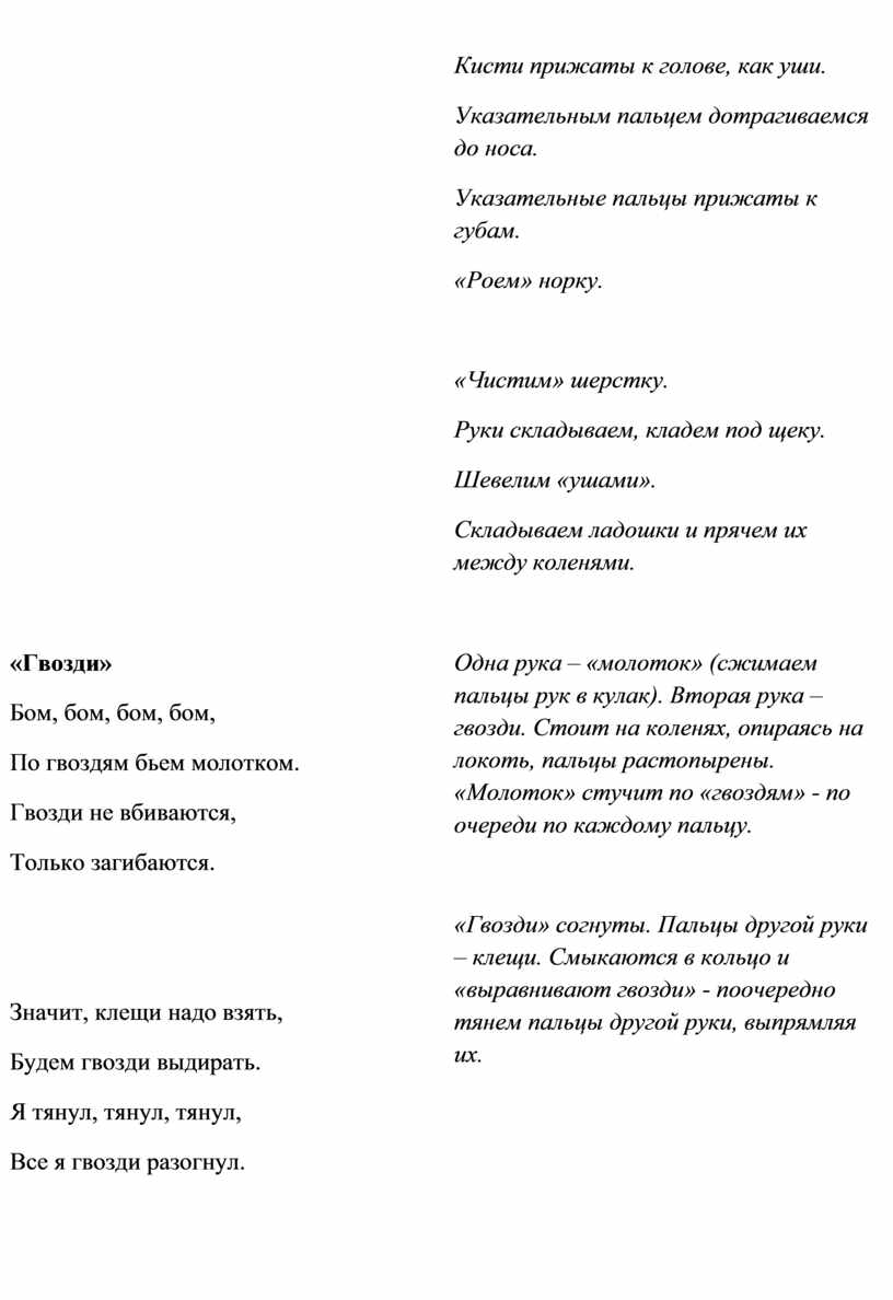 Одна рука – «молоток» (сжимаем пальцы рук в кулак). Вторая рука – гвозди. Стоит на коленях, опираясь на локоть, пальцы растопырены. «Молоток» стучит по «гвоздям» - по очереди по каждому пальцу.