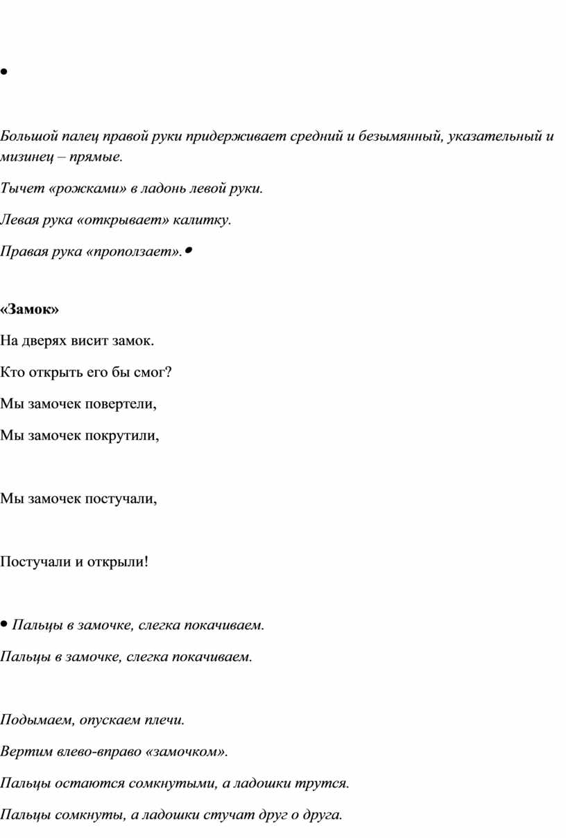 Подымаем, опускаем плечи. Вертим влево-вправо «замочком». Пальцы остаются сомкнутыми, а ладошки трутся. Пальцы сомкнуты, а ладошки стучат друг о друга. Раскрываем «замок». |