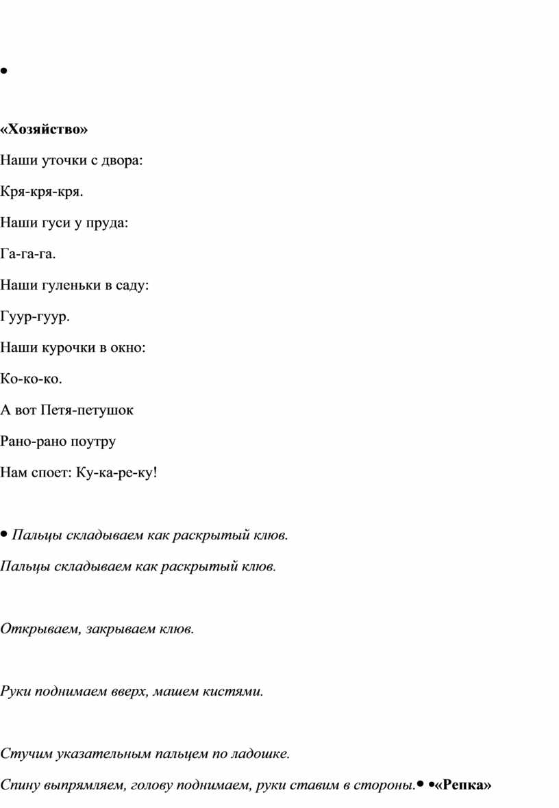 «Хозяйство» Наши уточки с двора: Кря-кря-кря. Наши гуси у пруда: Га-га-га. Наши гуленьки в саду: Гуур-гуур. Наши курочки в окно: Ко-ко-ко. А вот Петя-петушок Рано-рано поутру Нам споет: Ку-ка-ре-ку!