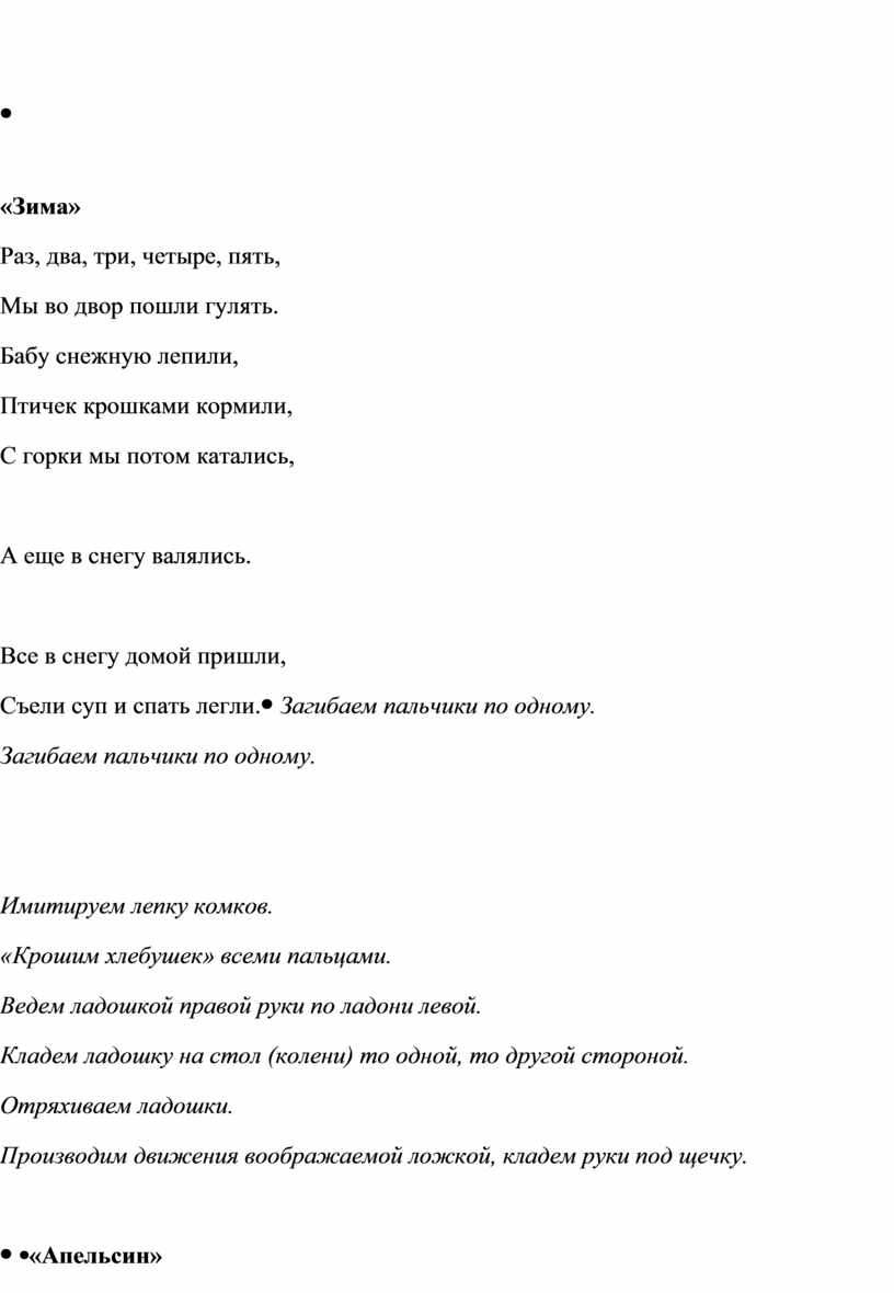 «Апельсин» Мы делили апельсин! Много нас, А он один. Эта долька для ежа, Эта долька для стрижа, Эта долька для утят, Эта долька для котят, Эта долька для бобра, А для волка кожура! Он сердит на нас, беда! Разбегайтесь кто куда! |