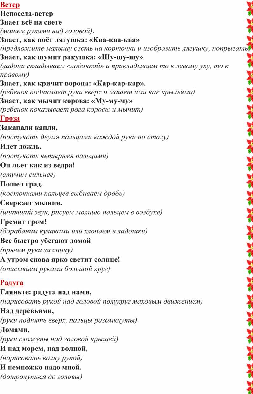С ветки ягодки снимаю, (Пальцы расслаблены, свисают вниз. Пальцами другой руки погладить каждый пальчик от основания до самого кончика, как будто снимая с него воображаемую ягодку.)