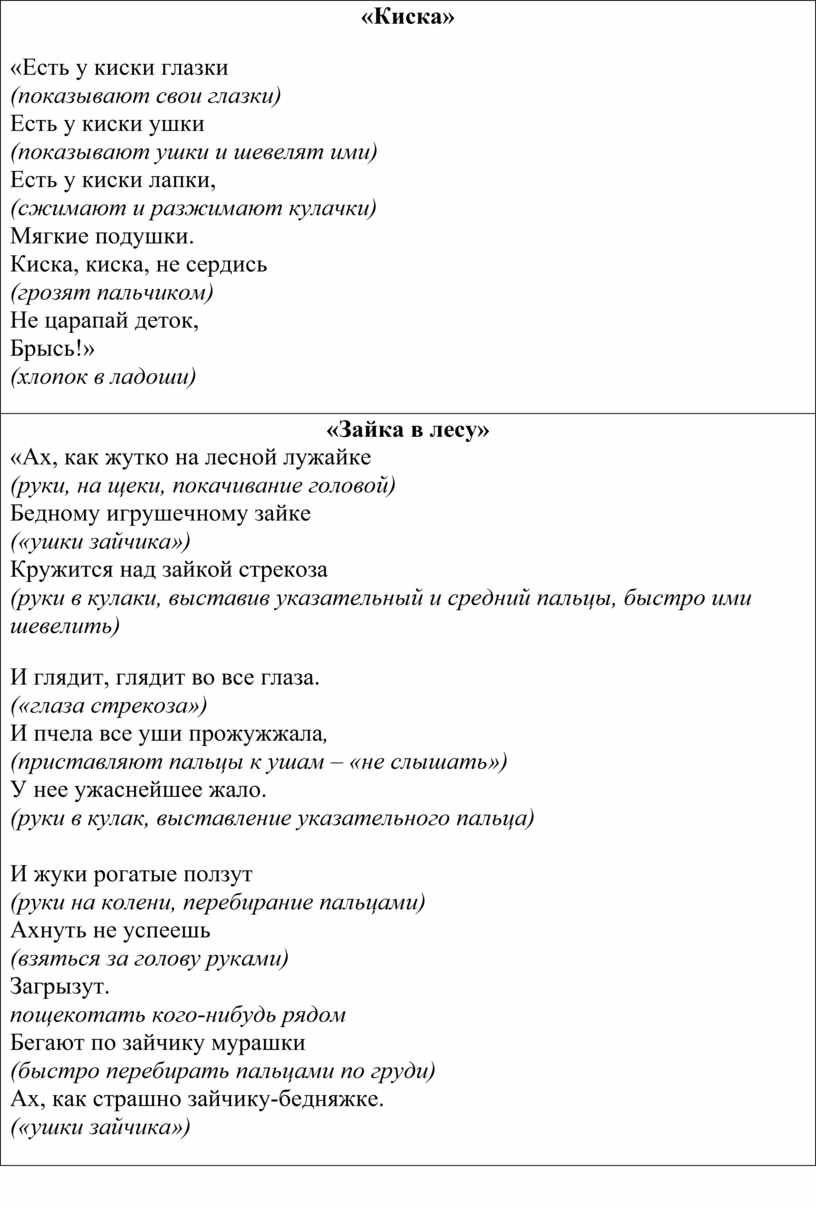 «Есть у киски глазки (показывают свои глазки) Есть у киски ушки (показывают ушки и шевелят ими) Есть у киски лапки, (сжимают и разжимают кулачки) Мягкие подушки. Киска, киска, не сердись (грозят пальчиком) Не царапай деток, Брысь!» (хлопок в ладоши)