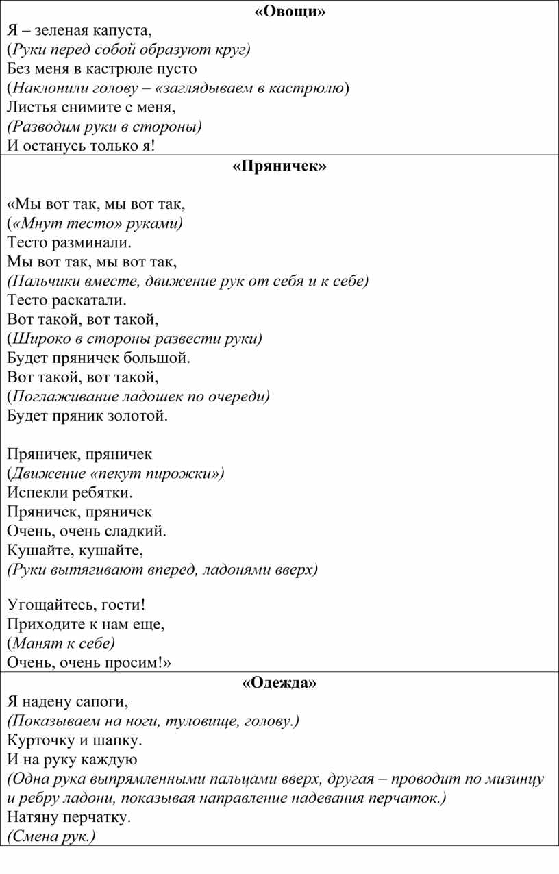 «Мы вот так, мы вот так, («Мнут тесто» руками) Тесто разминали. Мы вот так, мы вот так, (Пальчики вместе, движение рук от себя и к себе) Тесто раскатали. Вот такой, вот такой, (Широко в стороны развести руки) Будет пряничек большой. Вот такой, вот такой, (Поглаживание ладошек по очереди) Будет пряник золотой.