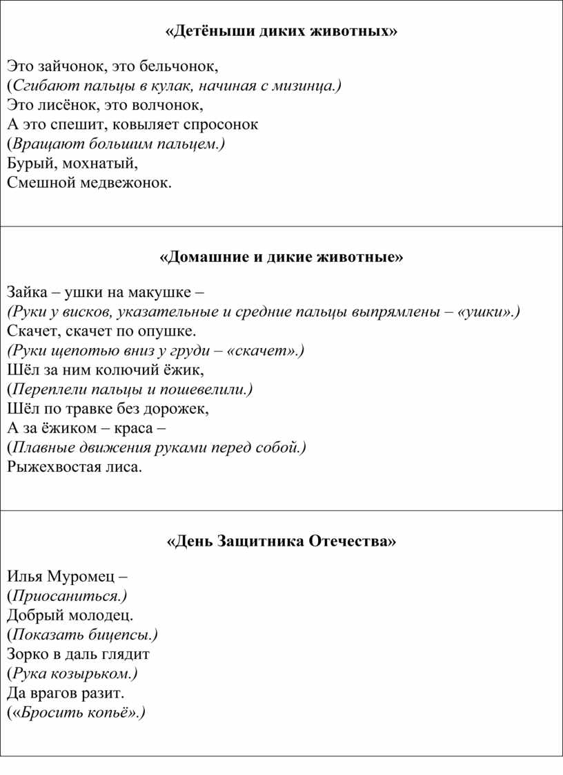 Зайка – ушки на макушке – (Руки у висков, указательные и средние пальцы выпрямлены – «ушки».) Скачет, скачет по опушке. (Руки щепотью вниз у груди – «скачет».) Шёл за ним колючий ёжик, (Переплели пальцы и пошевелили.) Шёл по травке без дорожек, А за ёжиком – краса – (Плавные движения руками перед собой.) Рыжехвостая лиса.