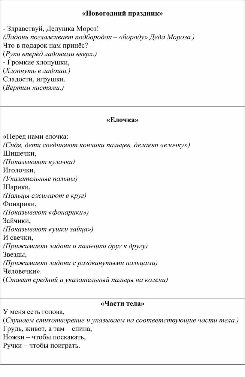 «Перед нами елочка: (Сидя, дети соединяют кончики пальцев, делают «елочку») Шишечки, (Показывают кулачки) Иголочки, (Указательные пальцы) Шарики, (Пальцы сжимают в круг) Фонарики, (Показывают «фонарики») Зайчики, (Показывают «ушки зайца») И свечки, (Прижимают ладони и пальчики друг к другу) Звезды, (Прижимают ладони с раздвинутыми пальцами) Человечки». (Ставят средний и указательный пальцы на колени)