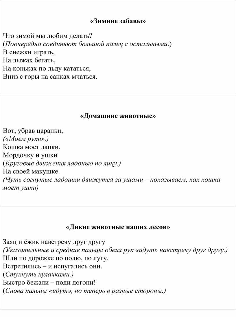 Это зайчонок, это бельчонок, (Сгибают пальцы в кулак, начиная с мизинца.) Это лисёнок, это волчонок, А это спешит, ковыляет спросонок (Вращают большим пальцем.) Бурый, мохнатый, Смешной медвежонок.