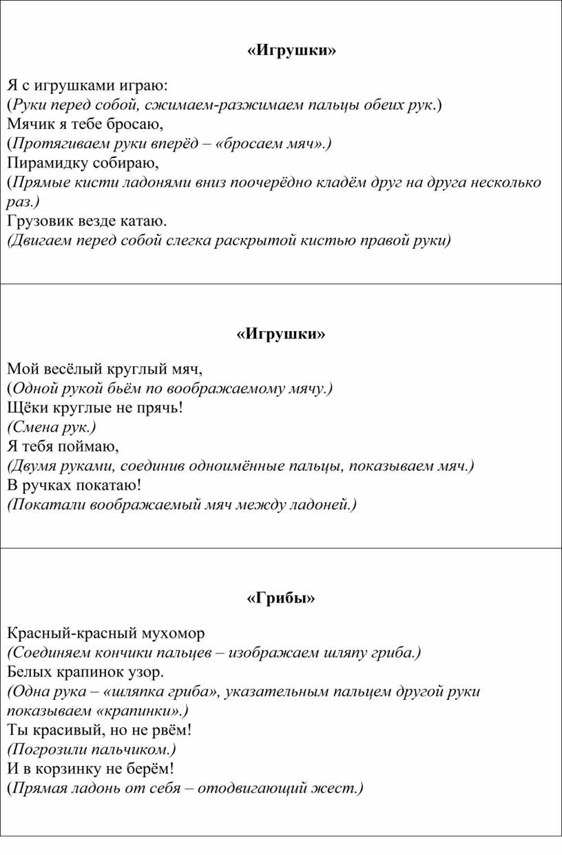 Я с игрушками играю: (Руки перед собой, сжимаем-разжимаем пальцы обеих рук.) Мячик я тебе бросаю, (Протягиваем руки вперёд – «бросаем мяч».) Пирамидку собираю, (Прямые кисти ладонями вниз поочерёдно кладём друг на друга несколько раз.) Грузовик везде катаю. (Двигаем перед собой слегка раскрытой кистью правой руки)