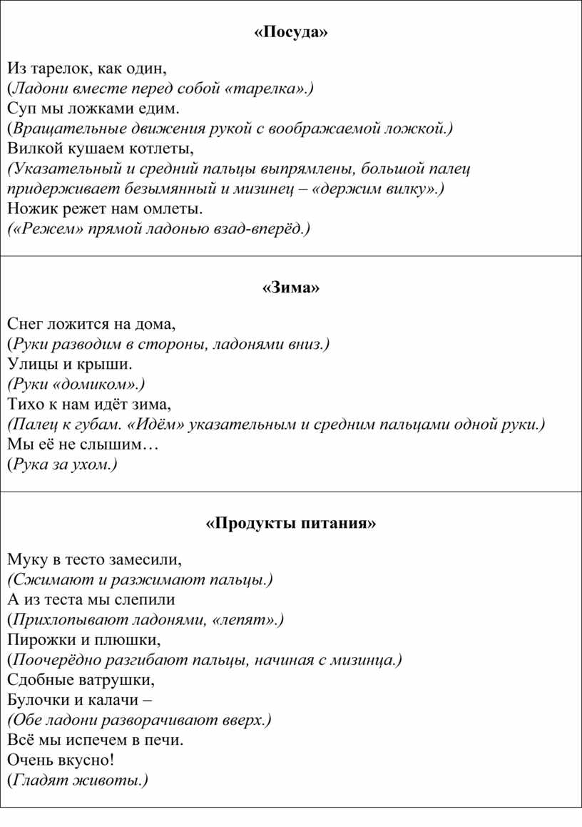 «Падал снег на порог. (дети плавно опускают руки сверху вниз) Кот слепил себе пирог. (показывают как пекут пирог) А пока лепил и пек, Ручейком пирог утек. (делают волнообразные движения руками) Пирожки себе пеки (грозят указательным пальцем) Не из снега – из муки». (покачивают пальцем из стороны в сторону)