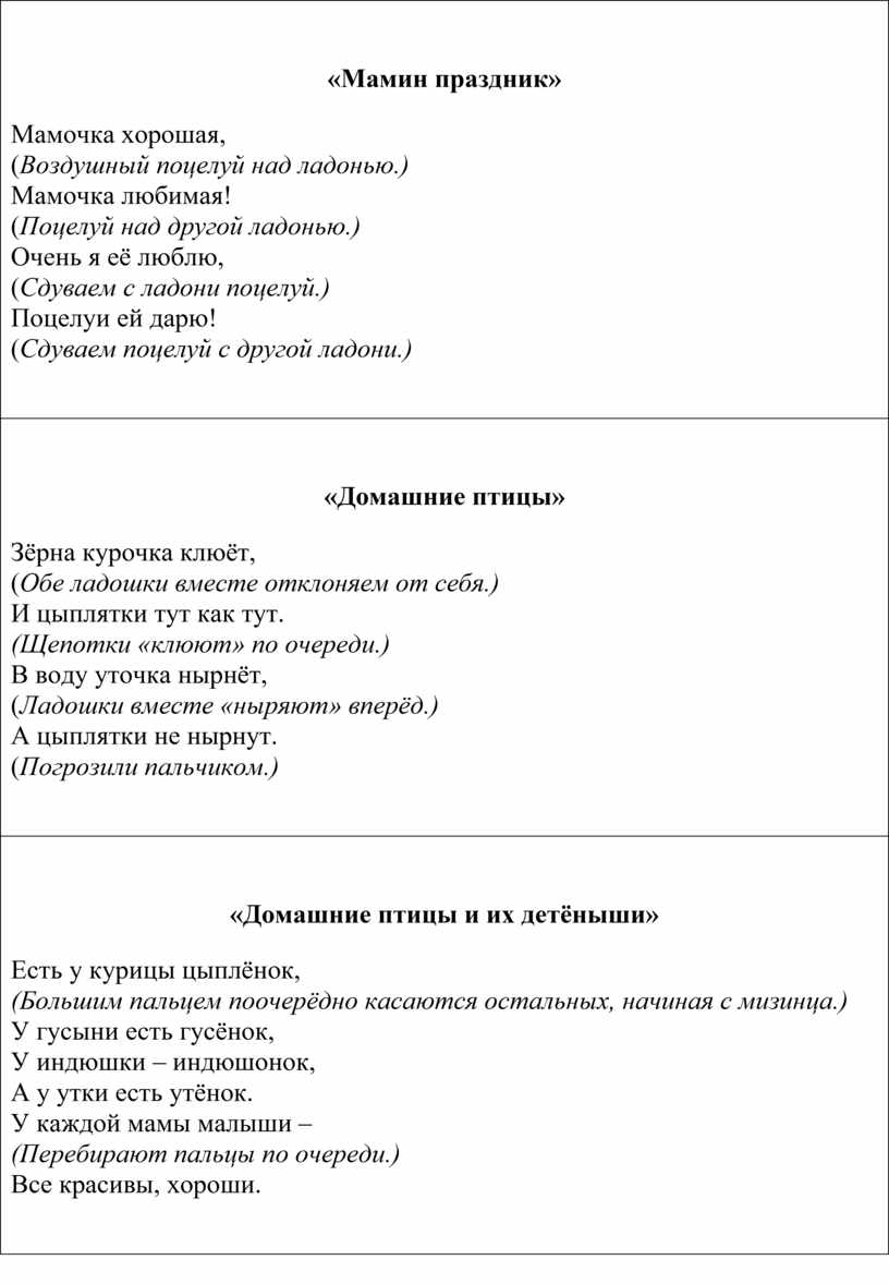 Есть у курицы цыплёнок, (Большим пальцем поочерёдно касаются остальных, начиная с мизинца.) У гусыни есть гусёнок, У индюшки – индюшонок, А у утки есть утёнок. У каждой мамы малыши – (Перебирают пальцы по очереди.) Все красивы, хороши.