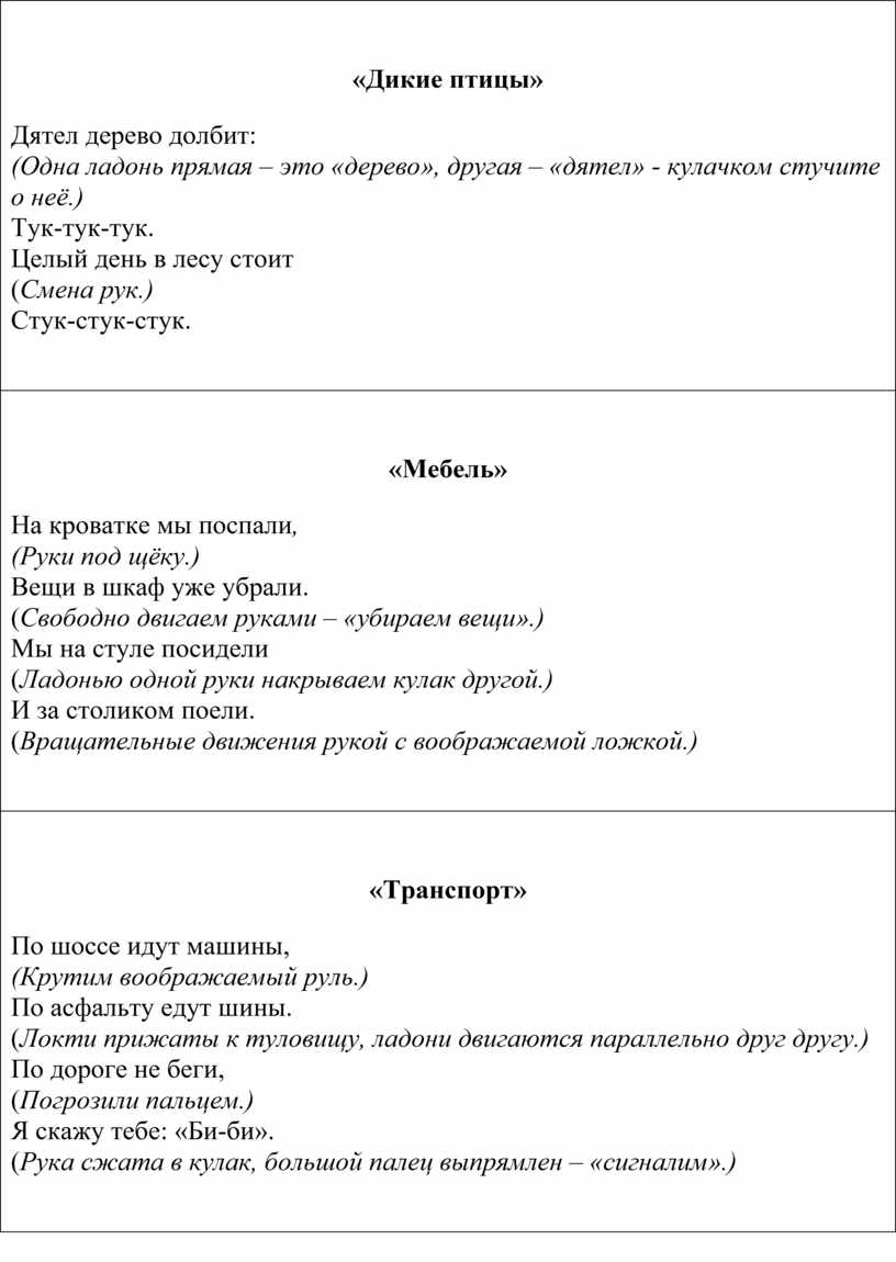 Дятел дерево долбит: (Одна ладонь прямая – это «дерево», другая – «дятел» - кулачком стучите о неё.) Тук-тук-тук. Целый день в лесу стоит (Смена рук.) Стук-стук-стук.