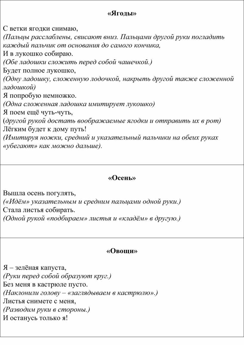 С ветки ягодки снимаю, (Пальцы расслаблены, свисают вниз. Пальцами другой руки погладить каждый пальчик от основания до самого кончика, И в лукошко собираю. (Обе ладошки сложить перед собой чашечкой.) Будет полное лукошко, (Одну ладошку, сложенную лодочкой, накрыть другой также сложенной ладошкой) Я попробую немножко. (Одна сложенная ладошка имитирует лукошко) Я поем ещё чуть-чуть, (другой рукой достать воображаемые ягодки и отправить их в рот) Лёгким будет к дому путь! (Имитируя ножки, средний и указательный пальчики на обеих руках «убегают» как можно дальше).
