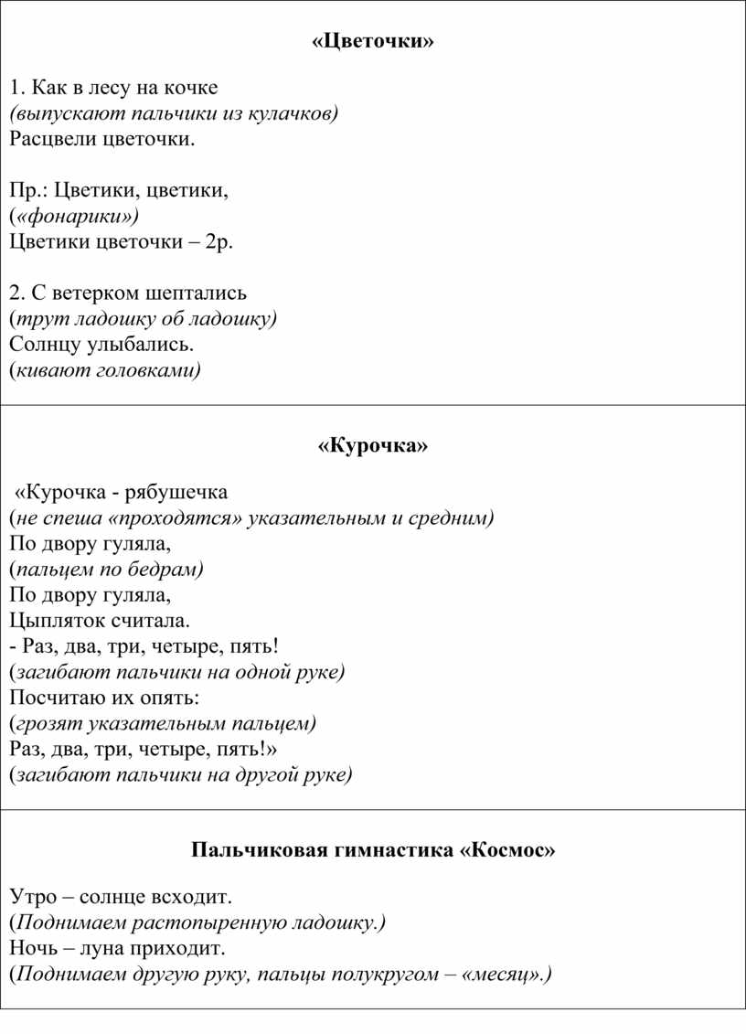 1. Как в лесу на кочке (выпускают пальчики из кулачков) Расцвели цветочки.