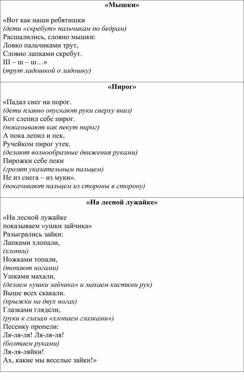 «Вот как наши ребятишки (дети «скребут» пальчикам по бедрам) Расшалились, словно мышки: Ловко пальчиками трут, Словно лапками скребут. Ш – ш – ш…» (трут ладошкой о ладошку)