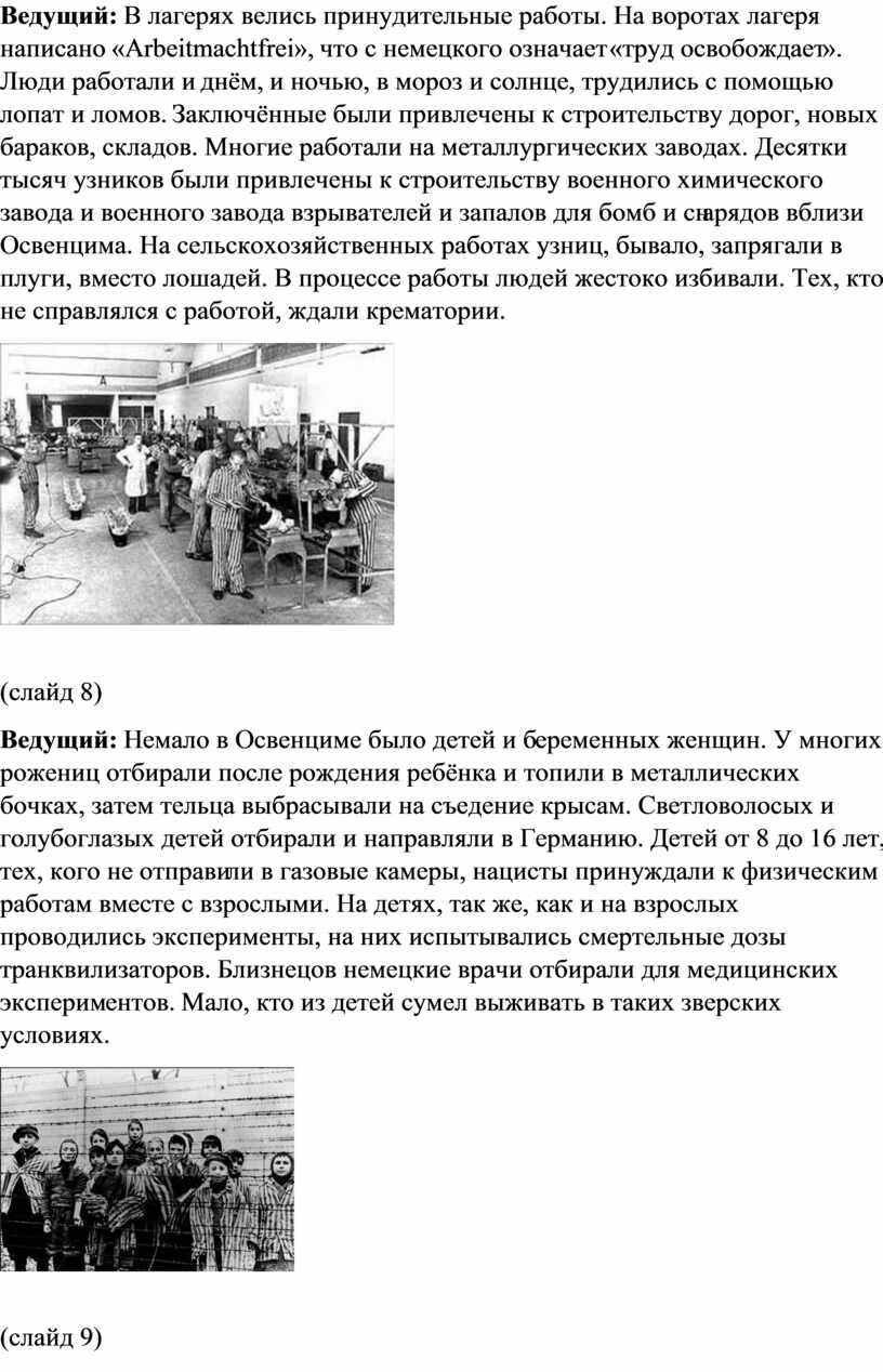 Ведущий: В лагерях велись принудительные работы. На воротах лагеря написано «Arbeitmachtfrei», что с немецкого означает «труд освобождает». Люди работали и днём, и ночью, в мороз и солнце, трудились с помощью лопат и ломов. Заключённые были привлечены к строительству дорог, новых бараков, складов. Многие работали на металлургических заводах. Десятки тысяч узников были привлечены к строительству военного химического завода и военного завода взрывателей и запалов для бомб и снарядов вблизи Освенцима. На сельскохозяйственных работах узниц, бывало, запрягали в плуги, вместо лошадей. В процессе работы людей жестоко избивали. Тех, кто не справлялся с работой, ждали крематории.
