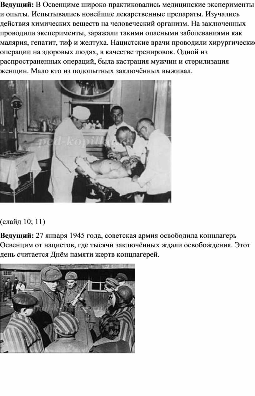 Ведущий: В Освенциме широко практиковались медицинские эксперименты и опыты. Испытывались новейшие лекарственные препараты. Изучались действия химических веществ на человеческий организм. На заключенных проводили эксперименты, заражали такими опасными заболеваниями как малярия, гепатит, тиф и желтуха. Нацистские врачи проводили хирургические операции на здоровых людях, в качестве тренировок. Одной из распространенных операций, была кастрация мужчин и стерилизация женщин. Мало кто из подопытных заключённых выживал.