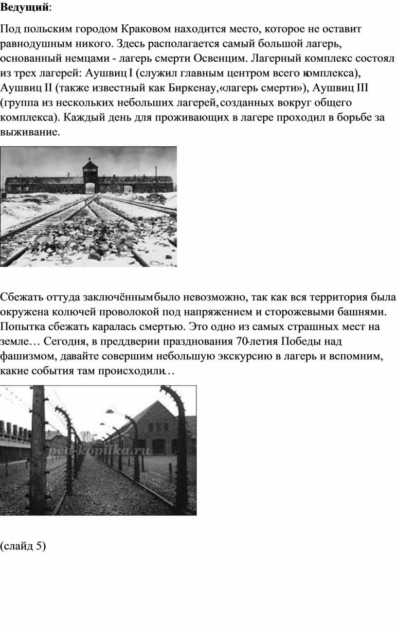 Ведущий: Немало в Освенциме было детей и беременных женщин. У многих рожениц отбирали после рождения ребёнка и топили в металлических бочках, затем тельца выбрасывали на съедение крысам. Светловолосых и голубоглазых детей отбирали и направляли в Германию. Детей от 8 до 16 лет, тех, кого не отправили в газовые камеры, нацисты принуждали к физическим работам вместе с взрослыми. На детях, так же, как и на взрослых проводились эксперименты, на них испытывались смертельные дозы транквилизаторов. Близнецов немецкие врачи отбирали для медицинских экспериментов. Мало, кто из детей сумел выживать в таких зверских условиях.