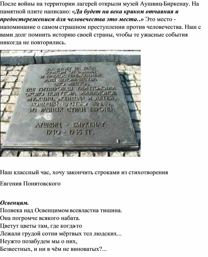 После войны на территории лагерей открыли музей Аушвиц-Биркенау. На памятной плите написано: «Да будет на века криком отчаяния и предостережением для человечества это место…» Это место - напоминание о самом страшном преступлении против человечества. Наш с вами долг помнить историю своей страны, чтобы те ужасные события никогда не повторились.