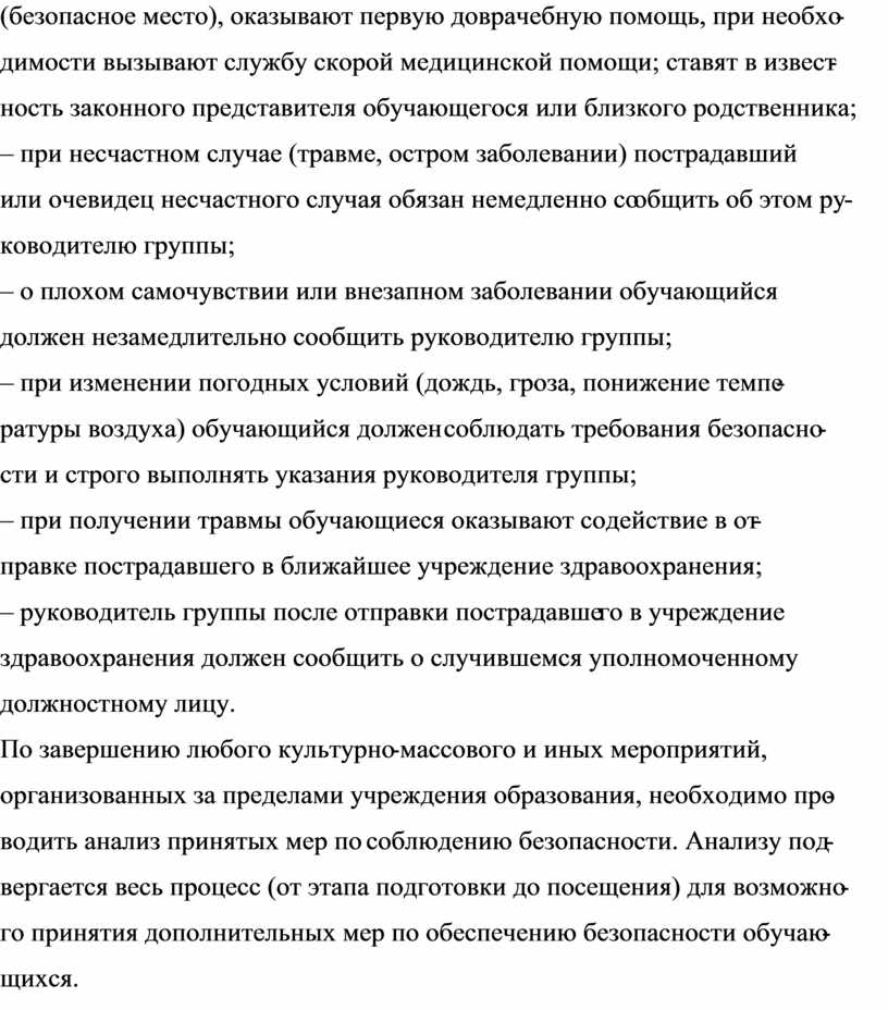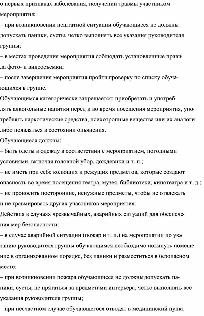 культурно-массовые и иные мероприятия. Обучающиеся, участвующие в культурно-массовом и иных мероприятиях должны осознавать ответственность за личное поведение и безопасность, что регламентируется рядом обязанностей по соблюдению мер безопасности.