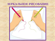 «Зеркальное рисование» Положите на стол чистый лист бумаги. Возьмите в обе руки по карандашу или фломастеру. Начните рисовать одновременно обеими руками зеркально-симметричные рисунки, буквы. При выполнении этого упражнения почувствуете, как расслабляются глаза и руки.