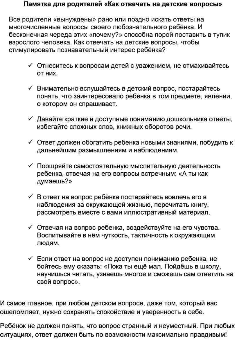 Памятка для родителей «Как отвечать на детские вопросы»