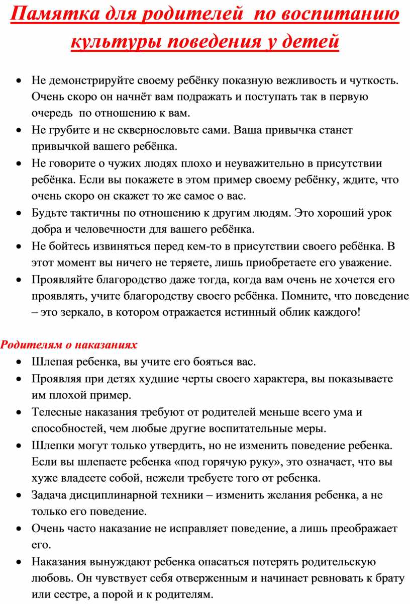Памятка для родителей по воспитанию культуры поведения у детей