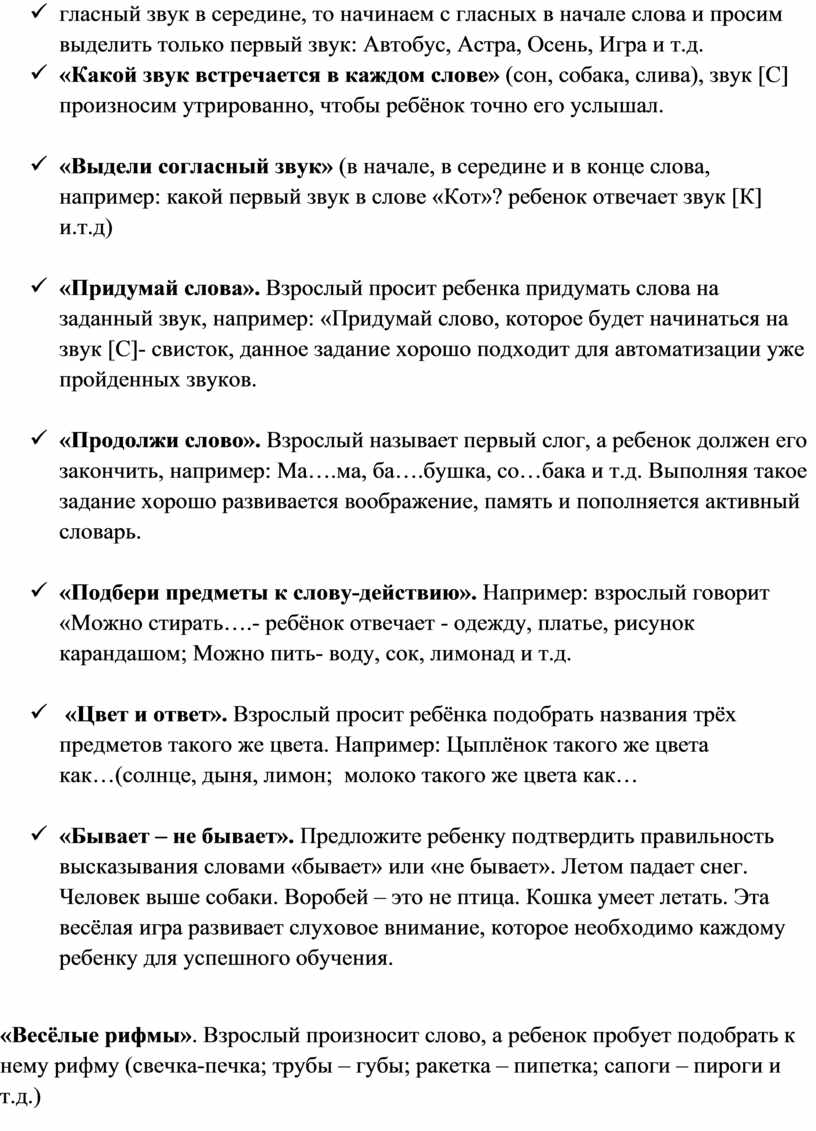 ü «Выдели гласный звук». Мама произносит слово, а ребёнок выделяет гласный звук (например: дом – звук [О], если ребёнку сложно выделить гласный звук в середине, то начинаем с гласных в начале слова и просим выделить только первый звук: Автобус, Астра, Осень, Игра и т.д.