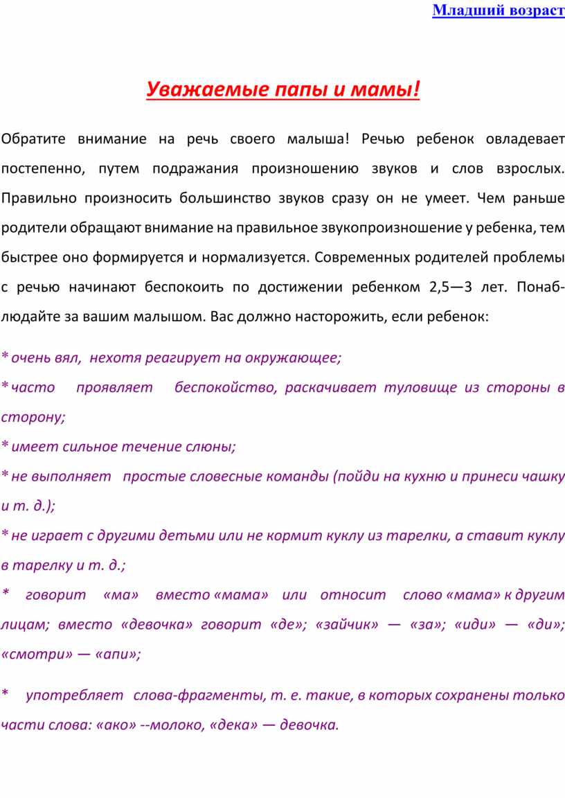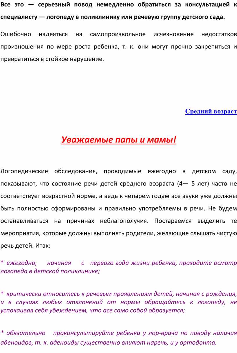 Логопедические обследования, проводимые ежегодно в детском саду, показывают, что состояние речи детей среднего возраста (4— 5 лет) часто не соответствует возрастной норме, а ведь к четырем годам все звуки уже должны быть полностью сформированы и правильно употребляемы в речи. Не будем останавливаться на причинах неблагополучия. Постараемся выделить те мероприятия, которые должны выполнять родители, желающие слышать чистую речь детей. Итак: