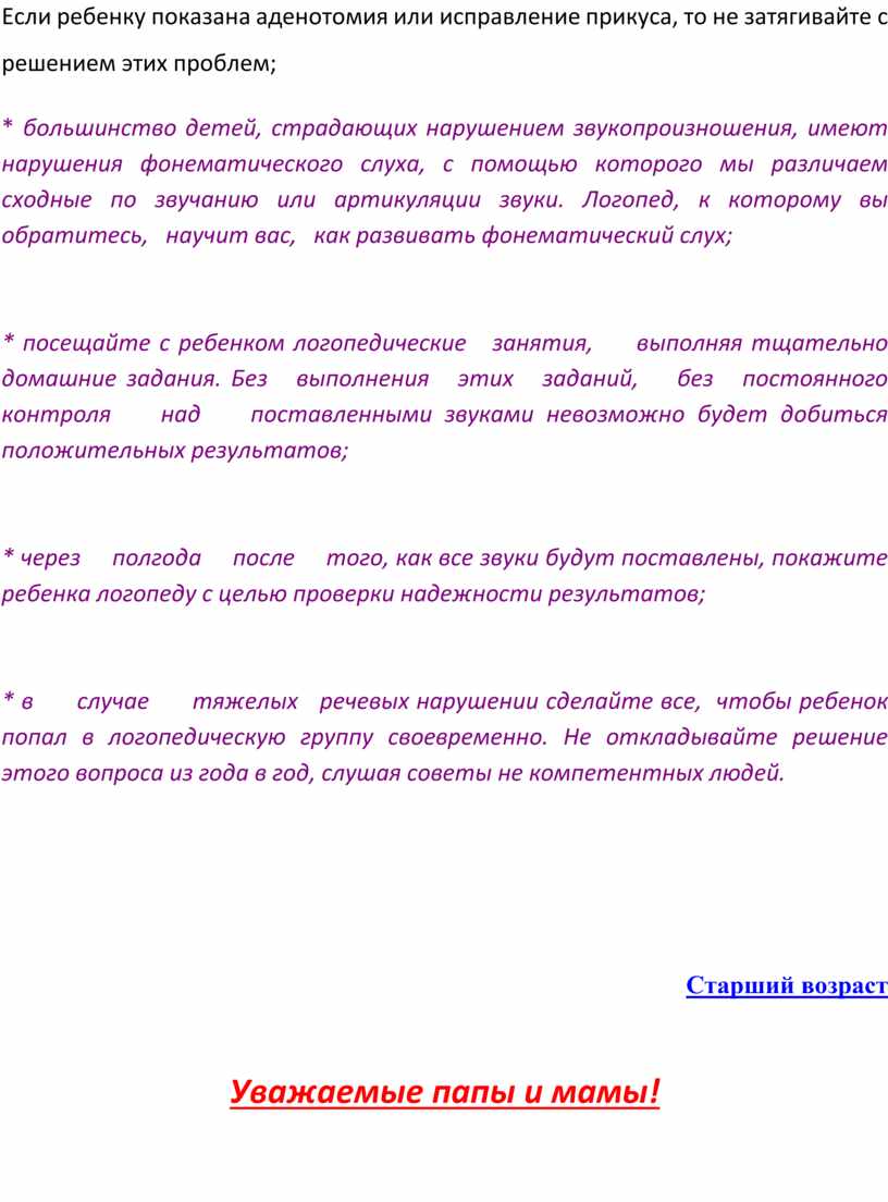 Ошибочно надеяться на самопроизвольное исчезновение недостатков произношения по мере роста ребенка, т. к. они могут прочно закрепиться и превратиться в стойкое нарушение.