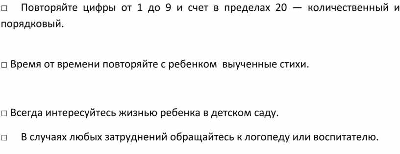 □ Повторяйте цифры от 1 до 9 и счет в пределах 20 — количественный и порядковый.