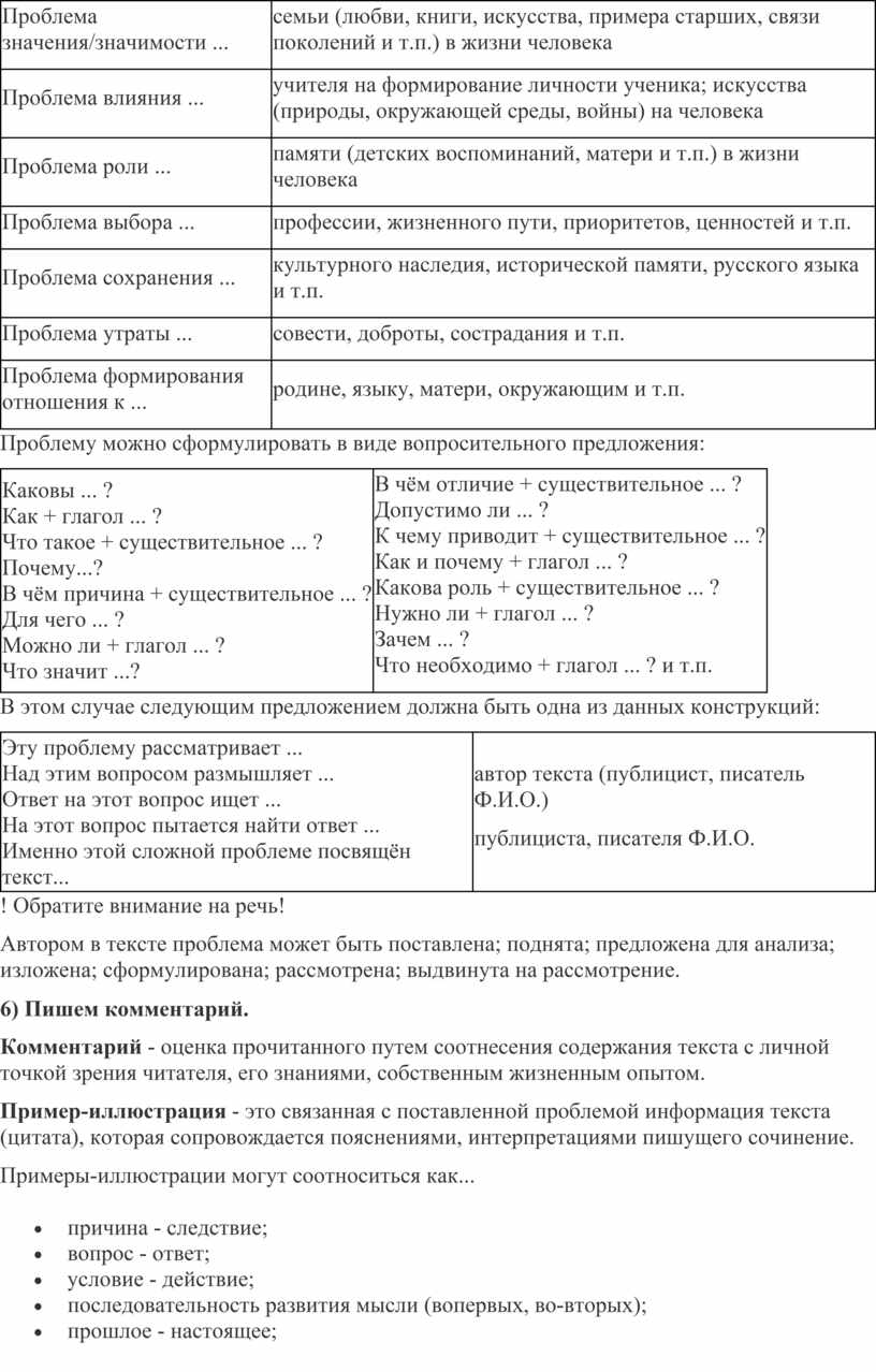 Глаголы, которые рекомендуется использовать в комментарии: (автор) размышляет, описывает, показывает, подчеркивает, обращает внимание (читателей), уделяет внимание, сравнивает (что с чем), сопоставляет (что с чем), противопоставляет (что чему), заостряет внимание, высказывает предположение, полагает, сравнивает, замечает, указывает (на что), объясняет, утверждает, отмечает, приводит примеры, опровергает, отстаивает, доказывает, уверен, предполагает, позволяет читателю увидеть, помогает понять (причины), обращается к, призывает читателей, приходит к выводу и т.д.