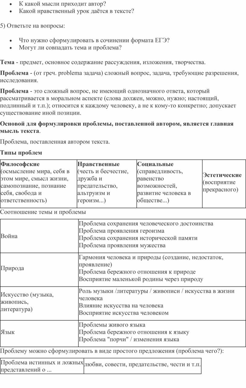 Основой для формулировки проблемы, поставленной автором, является главная мысль текста.