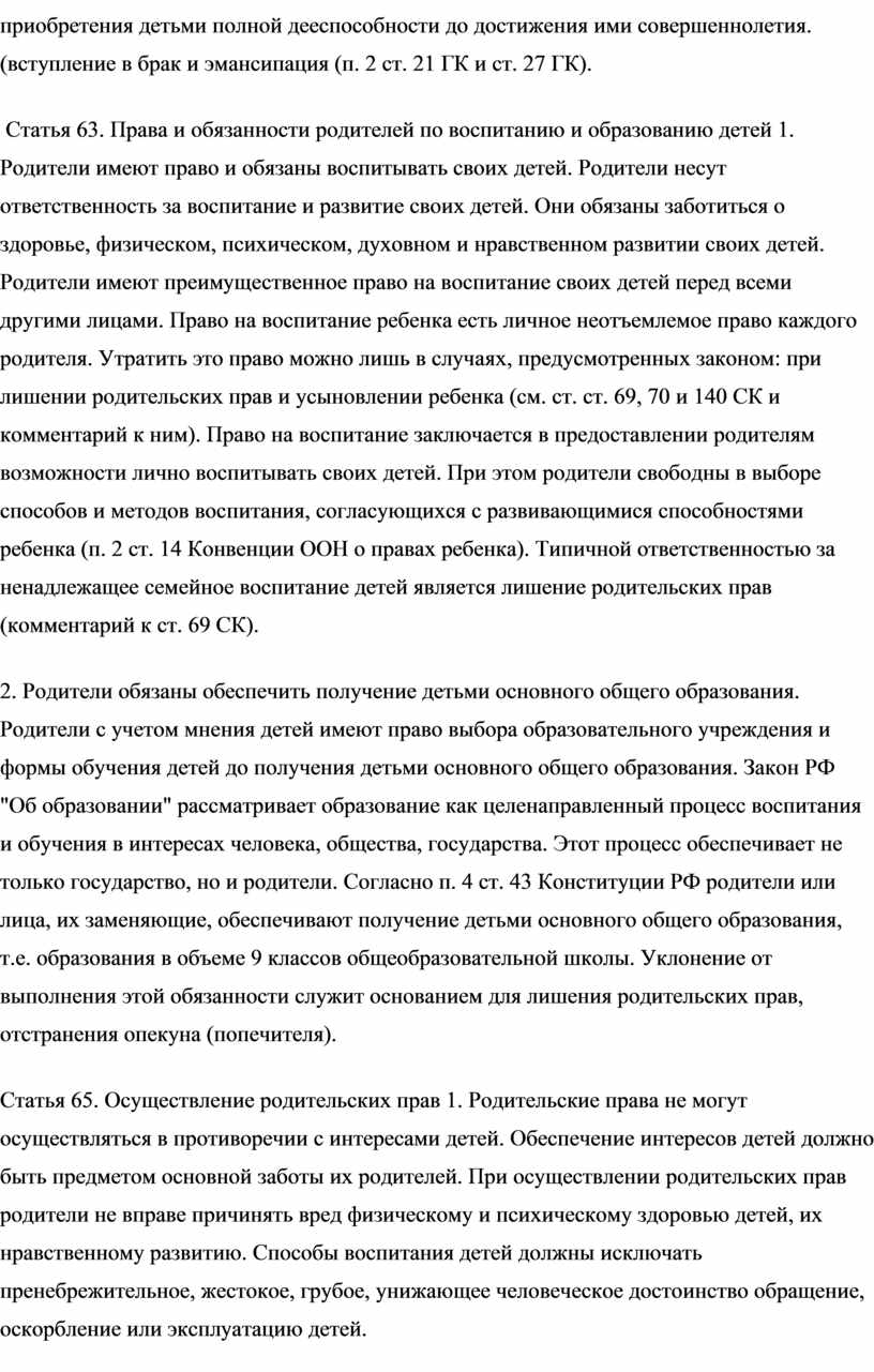 Статья 63. Права и обязанности родителей по воспитанию и образованию детей 1. Родители имеют право и обязаны воспитывать своих детей. Родители несут ответственность за воспитание и развитие своих детей. Они обязаны заботиться о здоровье, физическом, психическом, духовном и нравственном развитии своих детей. Родители имеют преимущественное право на воспитание своих детей перед всеми другими лицами. Право на воспитание ребенка есть личное неотъемлемое право каждого родителя. Утратить это право можно лишь в случаях, предусмотренных законом: при лишении родительских прав и усыновлении ребенка (см. ст. ст. 69, 70 и 140 СК и комментарий к ним). Право на воспитание заключается в предоставлении родителям возможности лично воспитывать своих детей. При этом родители свободны в выборе способов и методов воспитания, согласующихся с развивающимися способностями ребенка (п. 2 ст. 14 Конвенции ООН о правах ребенка). Типичной ответственностью за ненадлежащее семейное воспитание детей является лишение родительских прав (комментарий к ст. 69 СК).