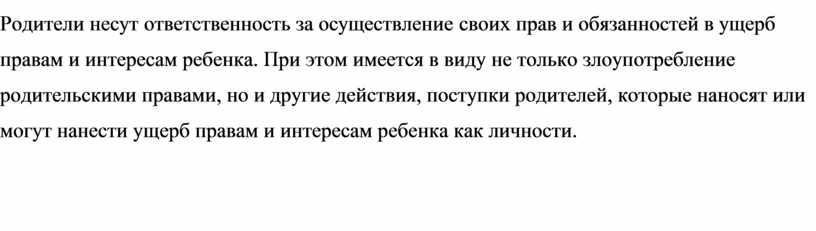 Родители несут ответственность за осуществление своих прав и обязанностей в ущерб правам и интересам ребенка. При этом имеется в виду не только злоупотребление родительскими правами, но и другие действия, поступки родителей, которые наносят или могут нанести ущерб правам и интересам ребенка как личности.