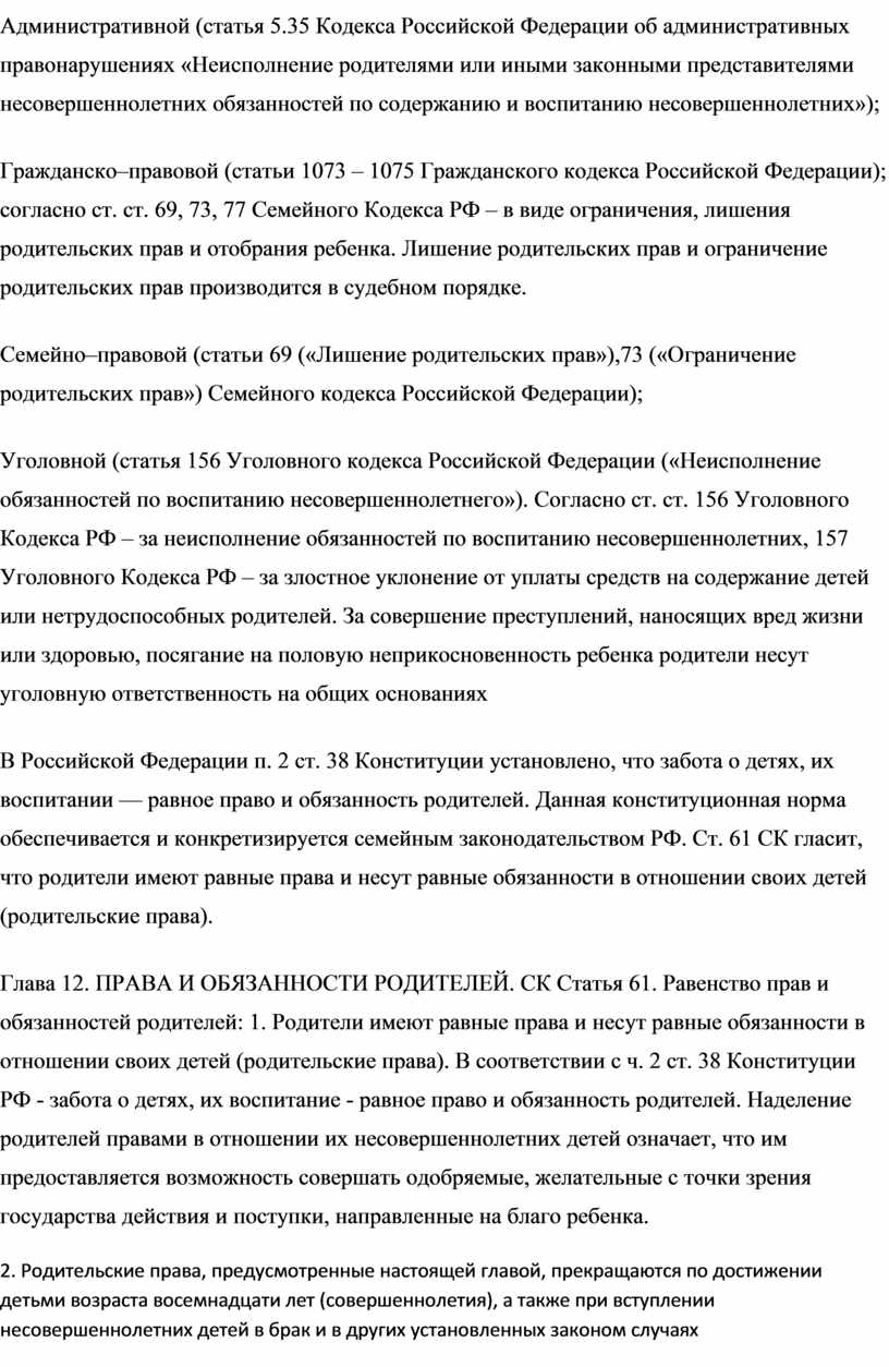 Административной (статья 5.35 Кодекса Российской Федерации об административных правонарушениях «Неисполнение родителями или иными законными представителями несовершеннолетних обязанностей по содержанию и воспитанию несовершеннолетних»);