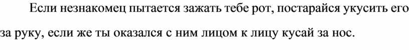 8. Если незнакомец пытается зажать тебе рот, постарайся укусить его за руку, если же ты оказался с ним лицом к лицу кусай за нос.