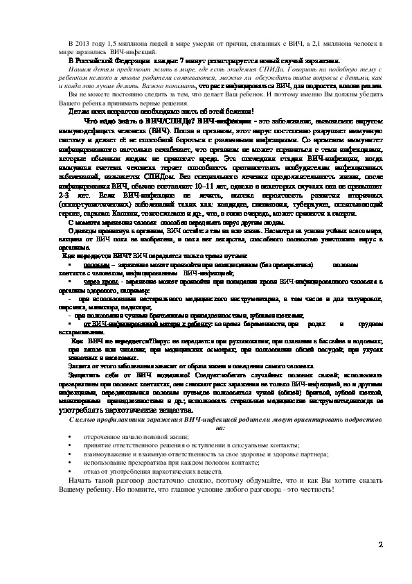 С целью профилактики заражения ВИЧинфекцией родители могут ориентировать подростков