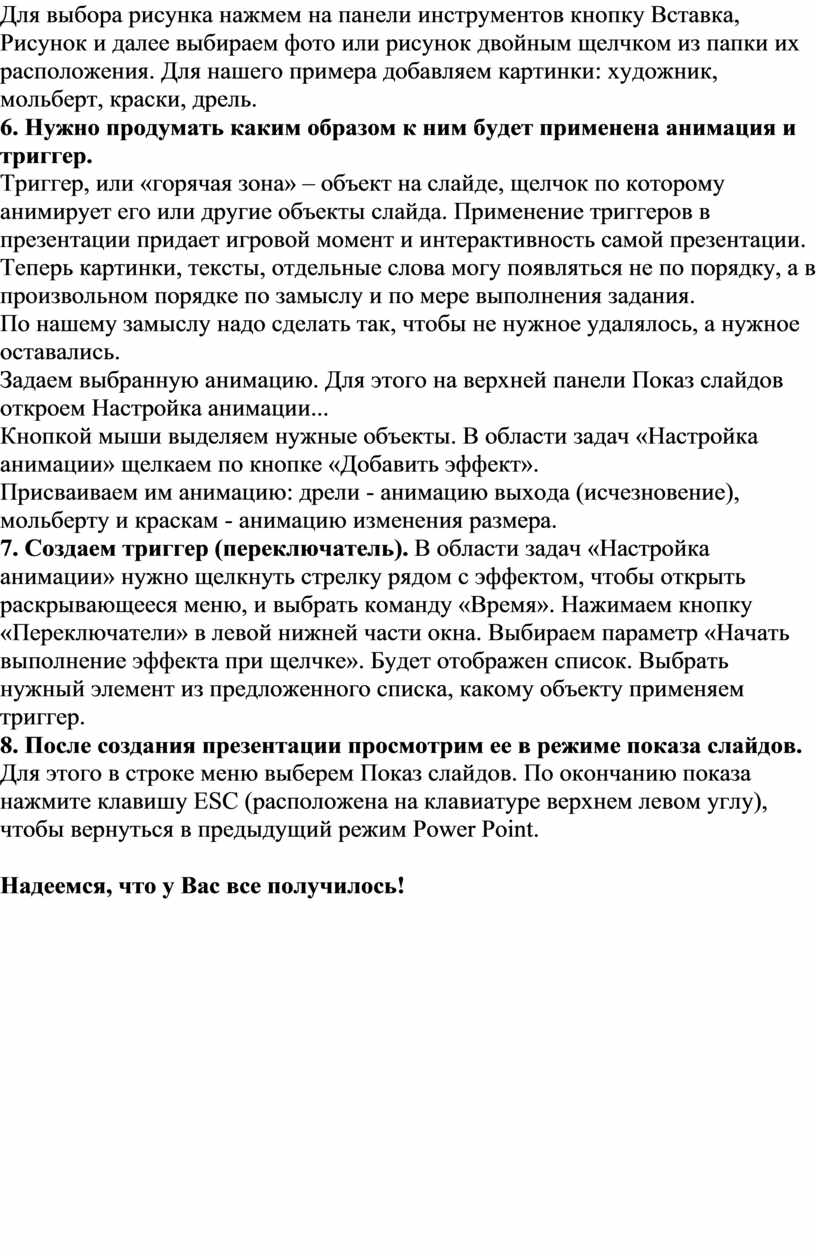 Триггер, или «горячая зона» – объект на слайде, щелчок по которому анимирует его или другие объекты слайда. Применение триггеров в презентации придает игровой момент и интерактивность самой презентации. Теперь картинки, тексты, отдельные слова могу появляться не по порядку, а в произвольном порядке по замыслу и по мере выполнения задания.